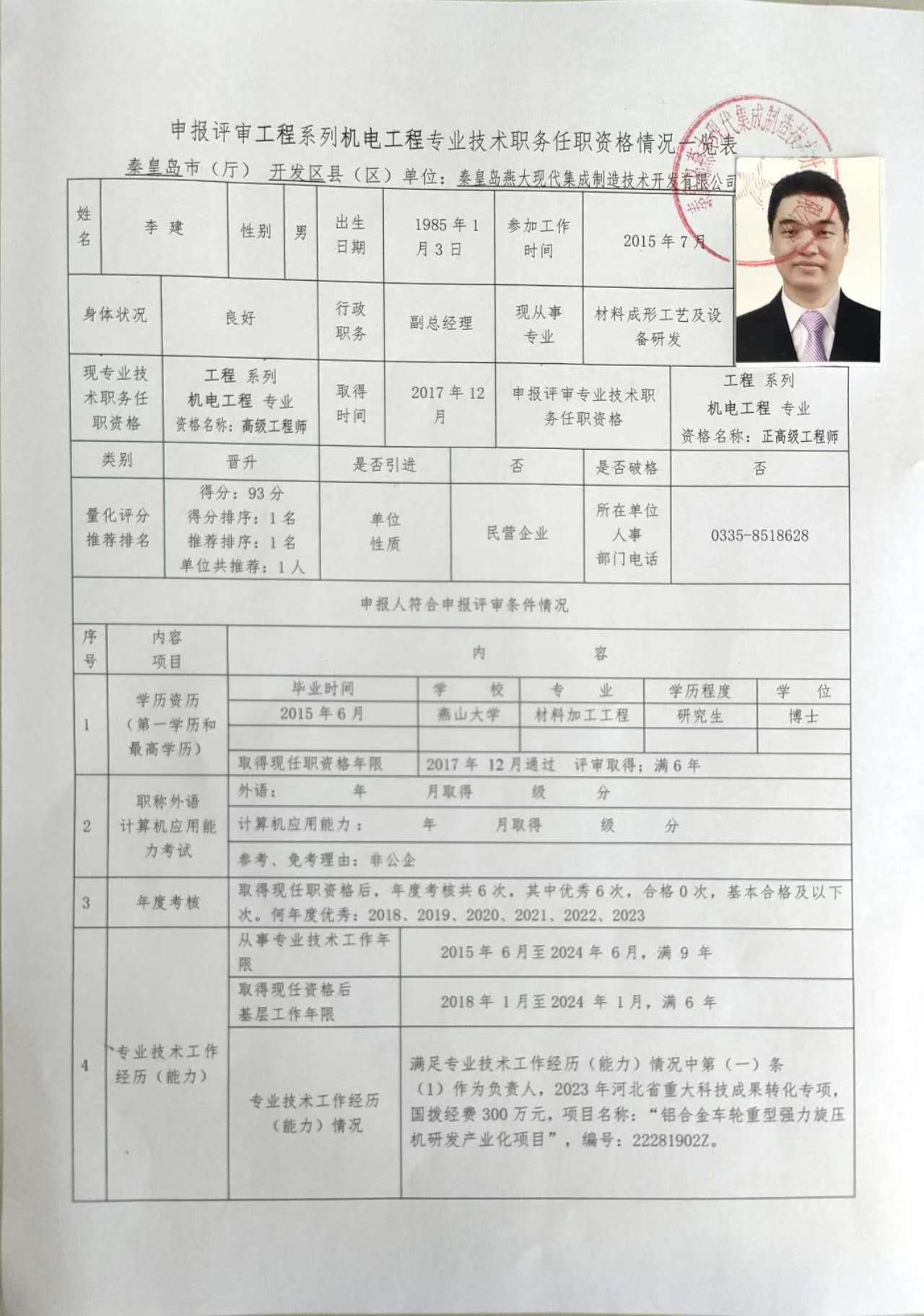 關(guān)于李建同志申報工程系列機(jī)電工程專業(yè)正高級工程師職務(wù)任職資格情況一覽表的公示